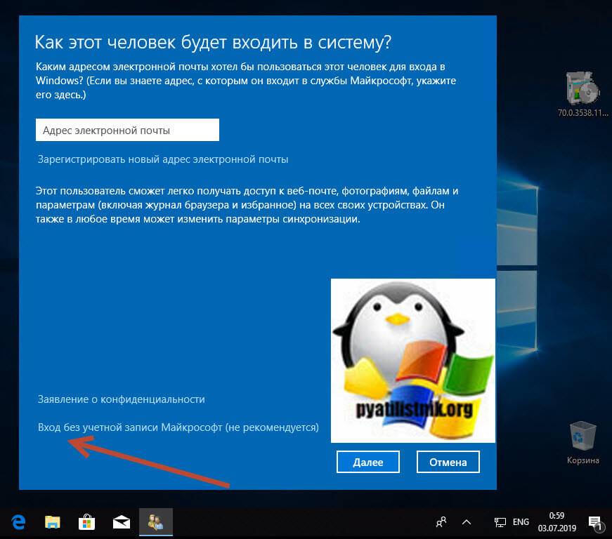 Выбираем “Вход без учетной записи Майкрософт” и далее.