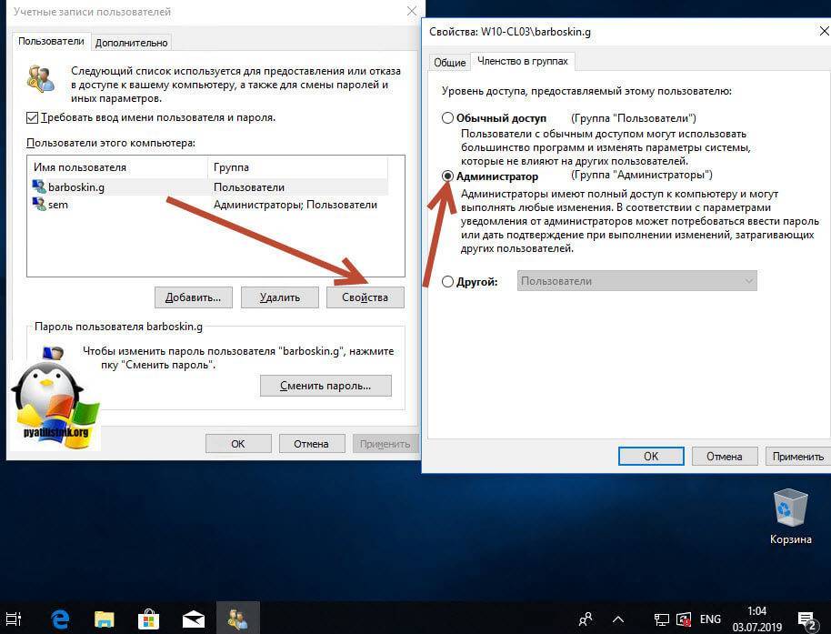 Выбираем нового пользователя, переходим в его свойства и назначаем ему группу “Администратор”
