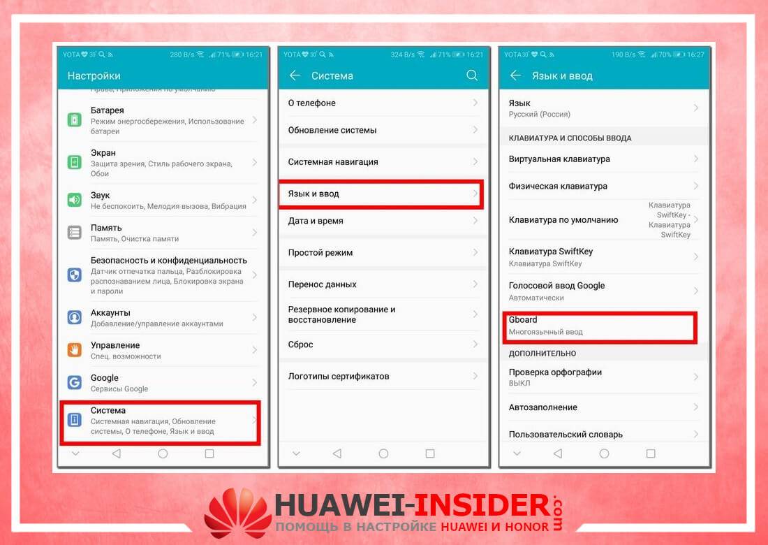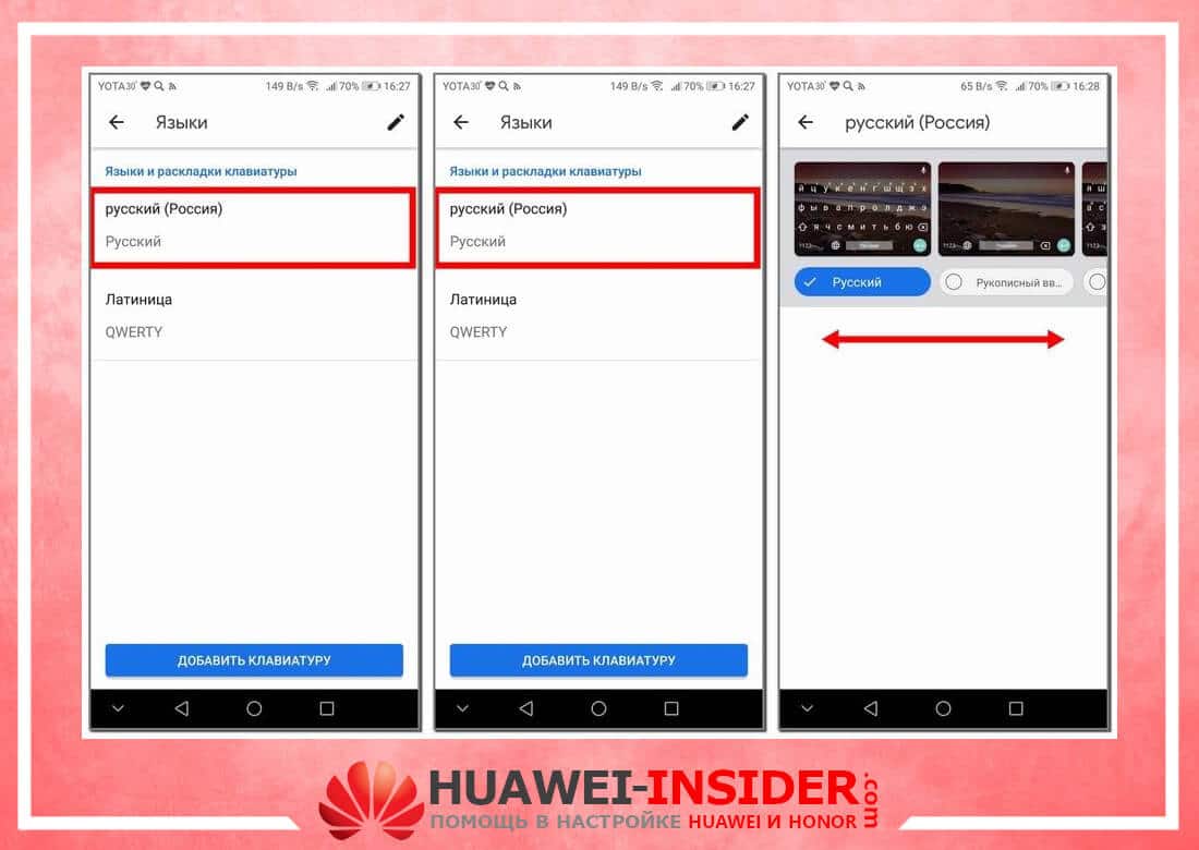 Порядок выбора раскладки клавиш на клавиатуре Gboard телефона HUAWEI (honor):