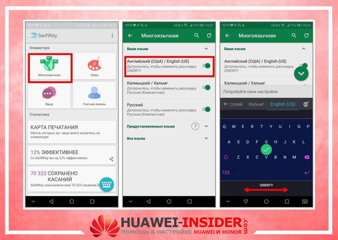 Порядок выбора раскладки клавиш на клавиатуре SwiftKey телефона HUAWEI (honor):