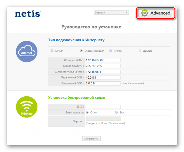 - Попадаем в мастер быстрой отладки. Здесь можно настроить само подключение и сеть «Вай-Фай» (установить пароль на неё). Для более серьёзных операций нужно идти в расширенные настройки. Так как с мастером справится даже новичок, расскажем о тонкой отладке — жмём на Advanced.