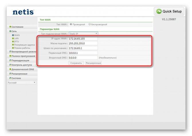 Статический IP настраивается легко: ставим в типе подключения Static IP, заполняем анкету данными из договора и сохраняемся.