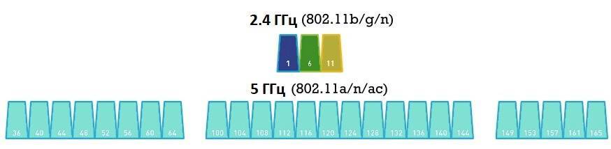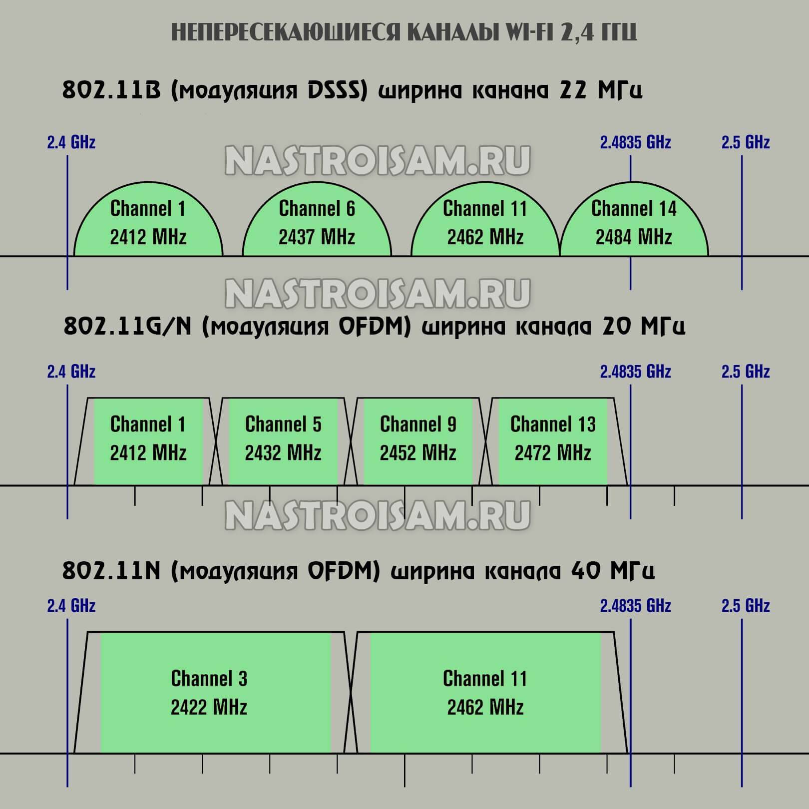 В настоящий момент по Вай-Фай используются полосы в двух радиочастотных диапазонах -2,4 ГГц и 5 ГГц. Каждый из них делится на каналы: 2.4 ГГц на 14 каналов (в России — 13), а 5 ГГЦ — на 23. Канал — это узкая полоса, позволяющая в рамках одной частоты уместить ряд беспроводных устройств без значительного влияния на работу друг друга. И у каждого из них есть своя ширина. В самом распространённом диапазоне 2,4 ГГц это выглядит следующим образом.