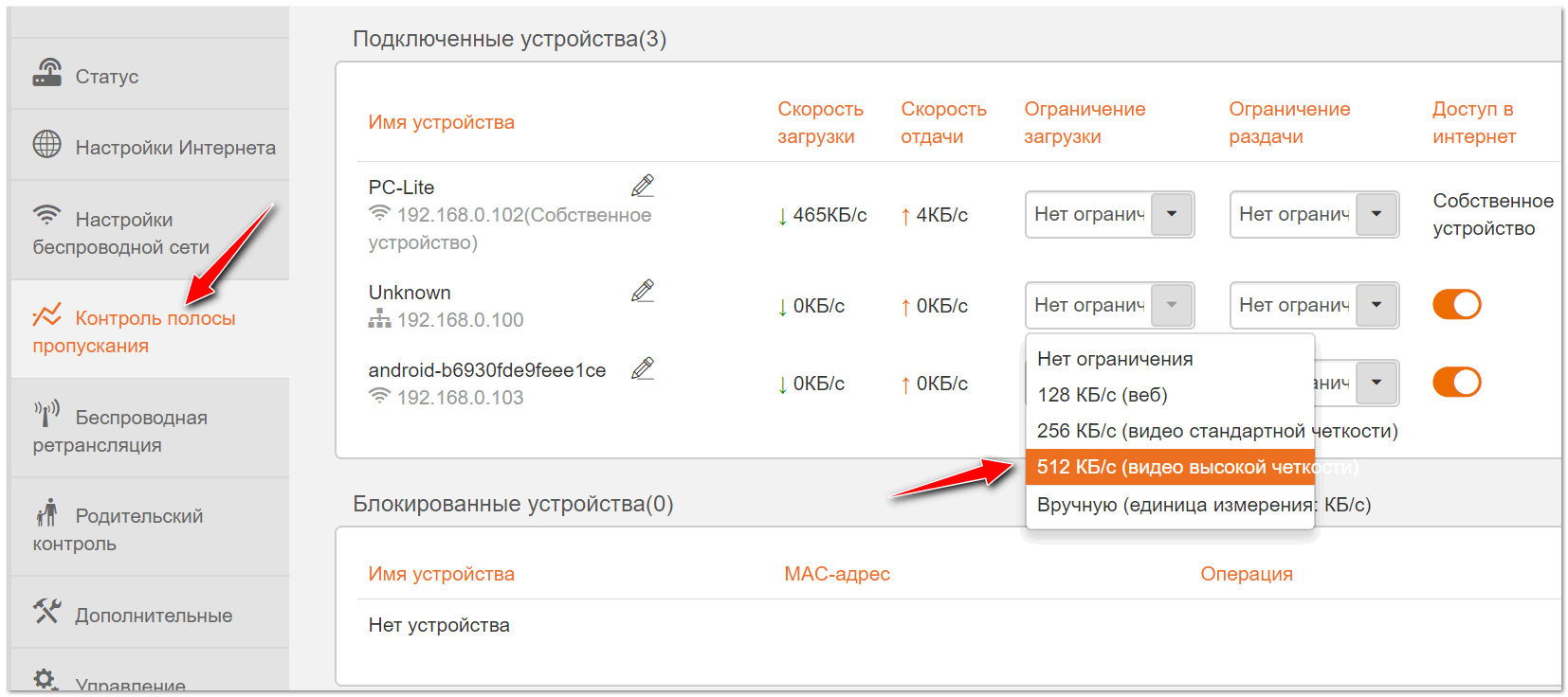 Ограничение скорость загрузки пользователю в 512 КБ/с (роутер Tenda)