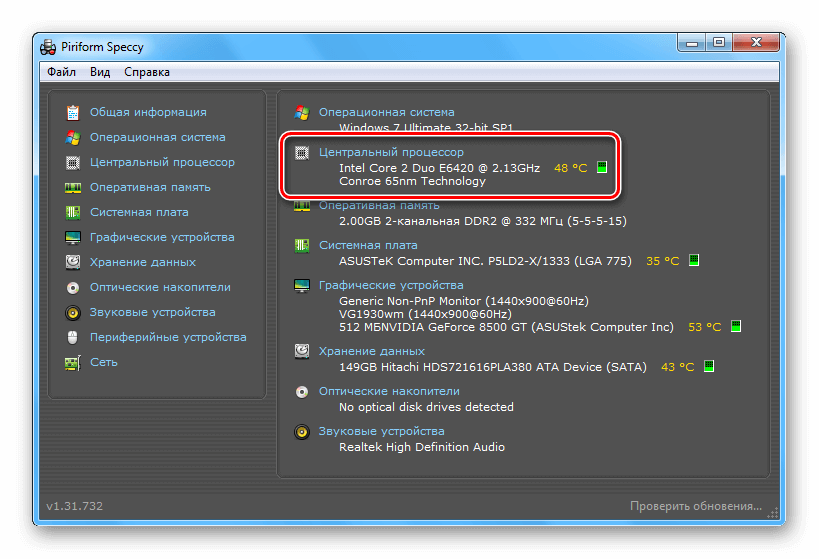 Чтобы увидеть всю нужную информацию достаточно просто открыть программу. Если нужны данные о процессоре, то найдите его название, которое будет отображено отдельным пунктом.
