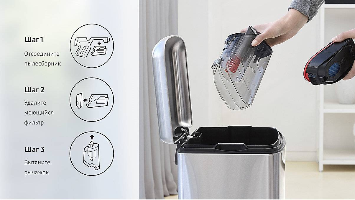 Главный модуль, требующий очистки — это фильтр с сине-белой индикацией, который промывается теплой водой. В отличие от других беспроводных пылесосов, в Samsung POWERStick Jet можно мыть практически полностью, а не только фильтр. Причем разобрать и собрать устройство можно даже без каких-либо дополнительных инструментов. После мытья систему необходимо основательно просушить перед последующей эксплуатацией.