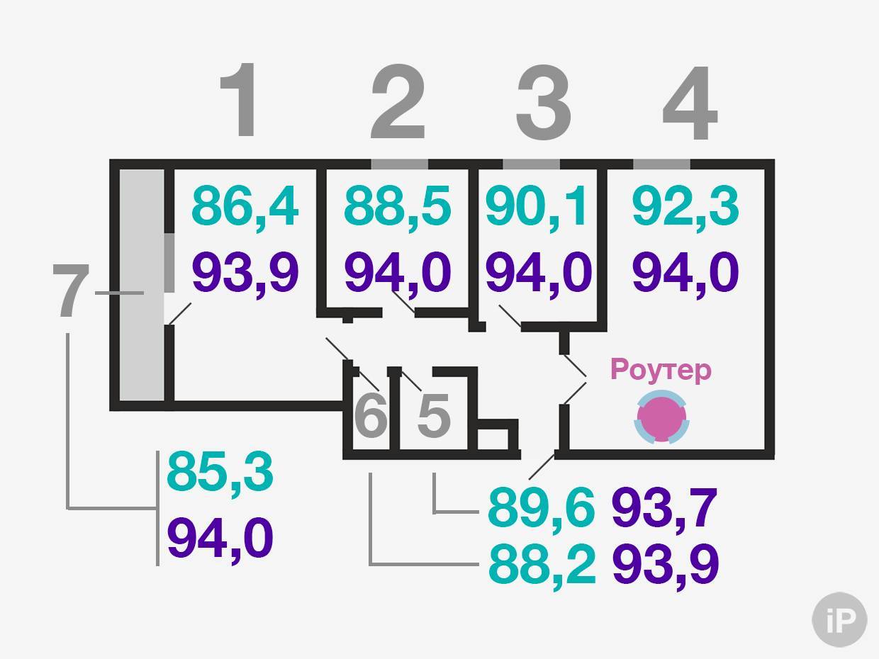 Домашний тест провёл во всех комнатах квартиры. У меня интересная ситуация, потому что роутер из-за особенностей проводки находится в самой дальней комнате по отношению ко всей остальной площади.