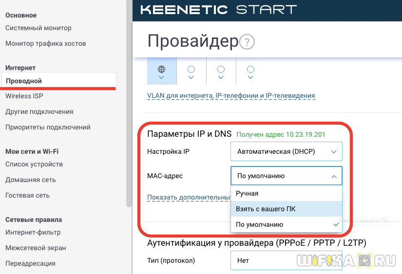 В случае с Keenetic порядок примерно такой же: переходим в настройки устройства, дальше выбираем WAN, устанавливаем необходимый тип соединения и сохраняем
