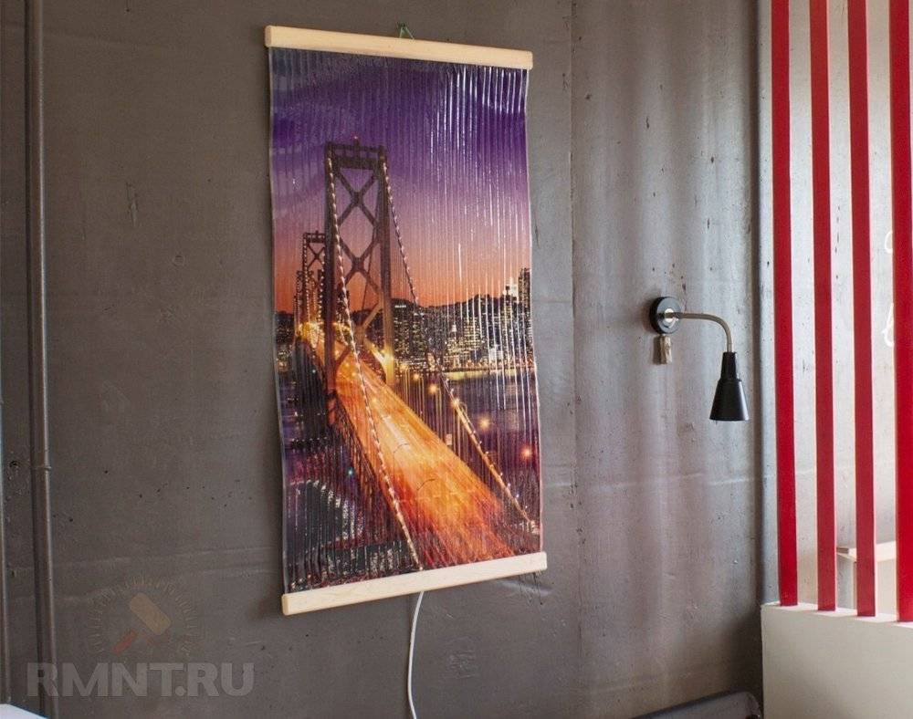 При покупке такого устройства стоит обращать внимание на материал, из которого изготовлены верхняя и нижняя планки. Благодаря им рисунок неплотно прилегает к стене и обеспечивает пожаробезопасность