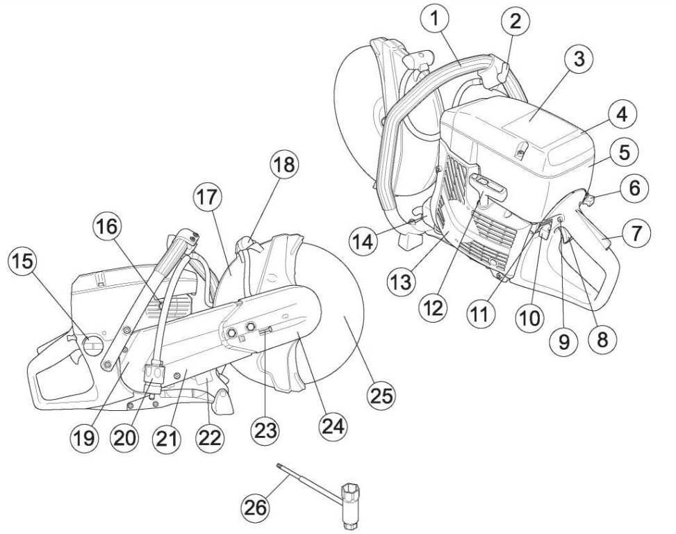 1 – Передняя ручка; 2 – Кран подачи воды; 3 – Предупреждающая наклейка; 4 – Крышка воздушного фильтра; 5 – Крышка цилиндра; 6 – Подсос; 7 – Рычаг блокировки курка газа; 8 – Курок газа; 9 – Фиксатор стартового газа; 10 – Контакт остановки; 11 – Функция отключения OilGuard (K750 OilGuard); 12 – Ручка стартера; 13 – Стартер; 14 – Глушитель; 15 – Топливный бак; 16 – Декомпрессионный клапан; 17 – Щит режущего диска; 18 – Ручка регулировки для защиты; 19 – Щит ремня; 20 – Подключение воды с фильтром; 21 – Режущий рычаг; 22 – Табличка данных; 23 – Натяжитель ремня; 24 – Режущий узел; 25 – Режущий диск; 26 – Универсальный ключ;