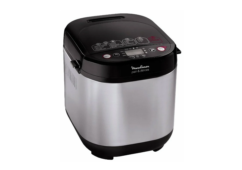 Одна из лучших хлебопечек марки Moulinex, получившая неплохой набор программ – целых 20, больше, чем у всех моделей в обзоре. В списке есть даже специальный режим для приготовления йогурта, а в комплектации – не только лопатка для перемешивания, но и спираль для извлечения миксера.