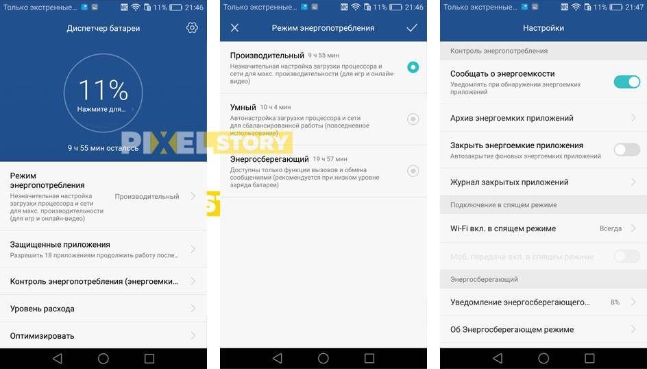 С точки зрения автономности аппарат чуть лучше большинства моделей того же класса. Тем не менее, Huawei предусмотрела три профиля использования аккумулятора со вполне говорящими названиями: производительный, «умный» (автоподстройка мощности процессора в зависимости от выполняемой задачи) и энергосберегающий.
