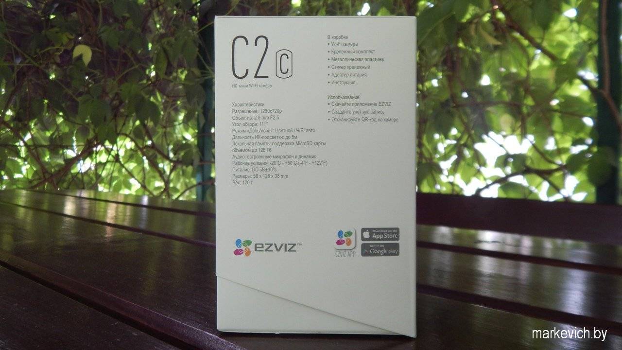 Ezviz C2C получила в свое распоряжение матрицу 1 Мп Hd Progressive Scan CMOS с размером 1/4” и разрешением 1280 × 720. Без подсветки она умеет снимать при уровне освещенности в 0,02 люмен, при включенной подсветке освещения может не быть (видимость в таком случае обеспечивается до 10 метров). Устройство имеет WDR (устраняет блики и засветы) и пишет ролики в формате H.264 с разрешением 1080p и 25 к/с. Широкоугольный объектив имеет охват 101°. Диафрагма — f/2.5, фокусное расстояние — 2.8 мм.