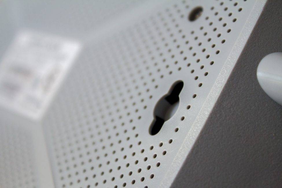 Нижняя часть корпуса содержит перфорацию для вентиляции, два отверстия для крепления на стену и наклейку со служебной информации. Есть четыре ножки, но особого смысла в них нет — они просто пластиковые, непрорезиненные и просто приподнимают корпус над поверхностью для улучшения притока воздуха.