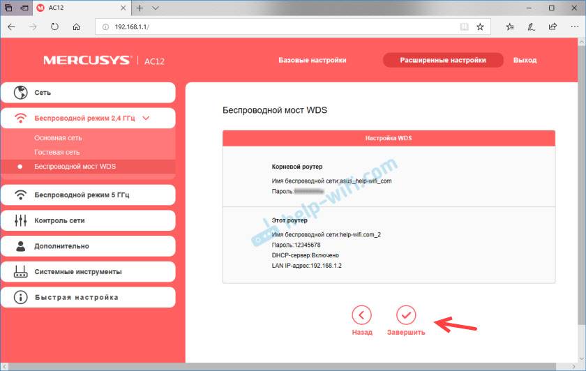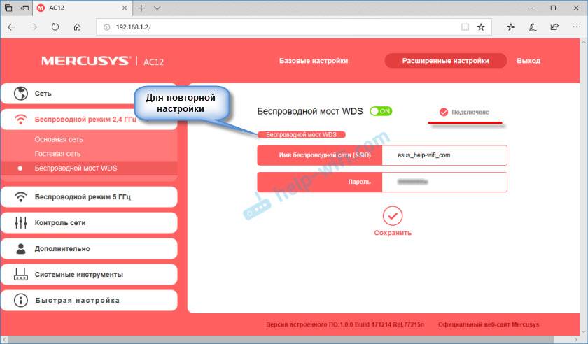 Если у вас «Отключено», то первым делом проверьте пароль от Wi-Fi сети корневого роутера. Я в процессе настройки неправильно указал пароль, и Mercusys не смог подключится в режиме моста. Скорректируйте пароль и нажмите «Сохранить». Так же можно запустить повторную настройку WDS.