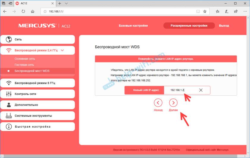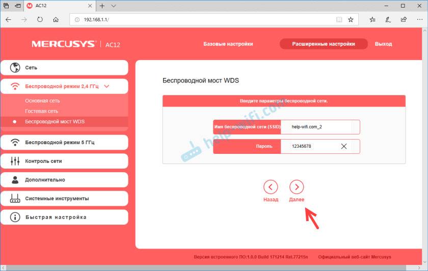 В web-интерфейсе переходим в раздел «Расширенные настройки» – «Беспроводной режим» (2.4 ГГц или 5 ГГц в зависимости от того, какой у вас роутер и к сети на какой частоте вы хотите его подключить) – «Беспроводной мост WDS» и нажимаем «Далее».