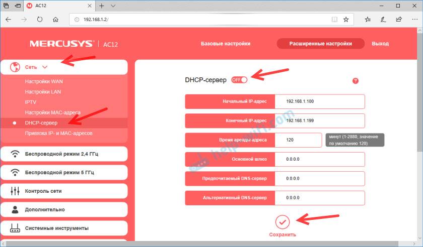 Перейдите в раздел «Сеть» – «DHCP-сервер» и отключите его. Сохраните настройки.