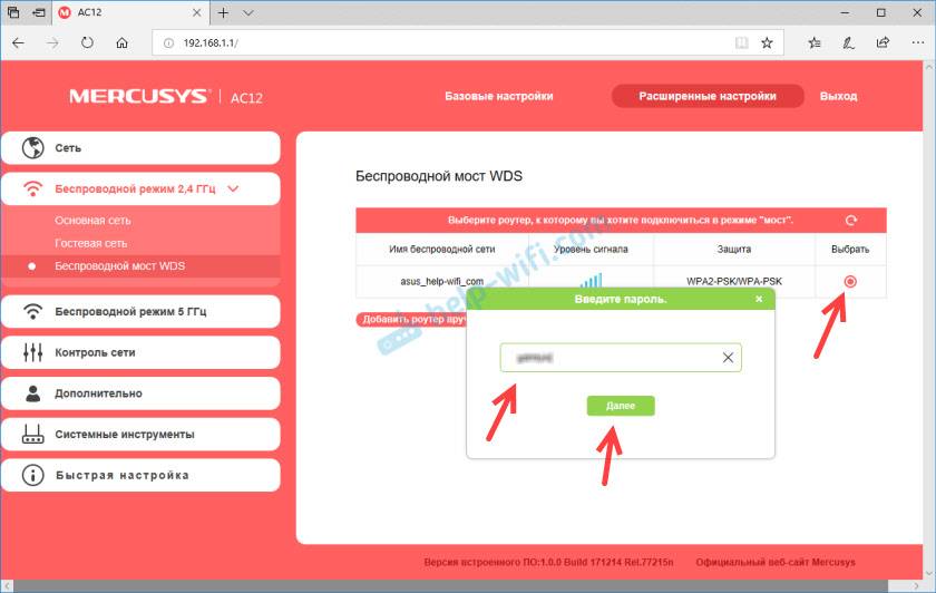 Роутер начнет искать доступные Wi-Fi сети в выбранном диапазоне. В списке будет указано имя сети (SSID), уровень сигнала и тип защиты. Ставим переключатель «Выбрать» напротив своей сети. Появится окно, в котором нужно ввести пароль от сети, к которой мы хотим подключится. Обязательно убедитесь, что пароль вы ввели правильно.