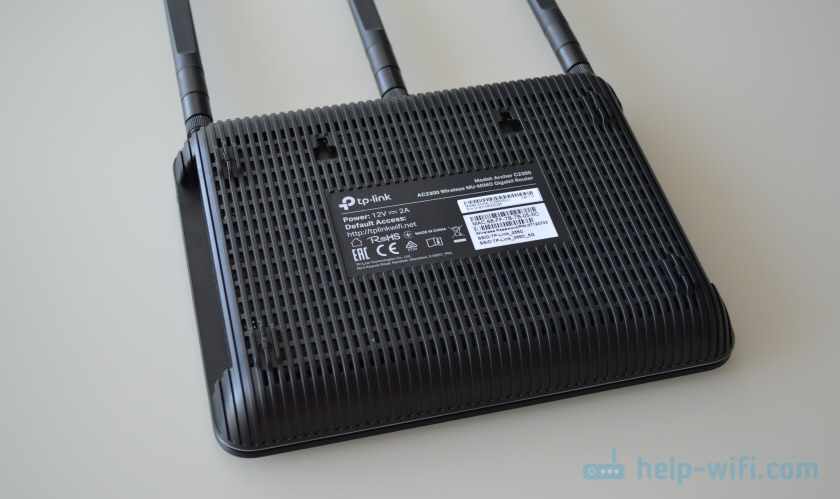 Снизу есть много отверстий для вентиляции воздуха и охлаждения мощного железа, наклейка с заводской информацией и какие-то маленькие резиновые ножки, которые честно говоря малоэффективны. Но роутер уже не так скользит, как на пластмассовых ножках.