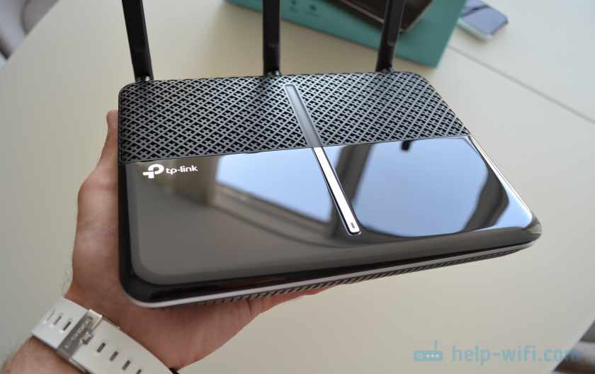 Практически весь корпус выполнен из качественного матового пластика. Верхняя крышка разделена на две части. Первая сделана из матового пластика с необычной текстурой и отверстиями для вентиляции, а вторая из глянцевого пластика (который понятное дело очень пачкается и царапается). Есть вставки из серебристого пластика, которые отлично дополняет логотип компании TP-Link такого же цвета. Индикаторы находятся сверху и выделены специальной полоской. Их можно увидеть только тогда, когда TP-Link Archer C2300 включен. Нижняя часть серебристой полоски – это кнопка для отключения индикаторов. Но я не очень понял для чего нужна эта кнопка, ведь индикаторы светят очень тускло даже в темноте.