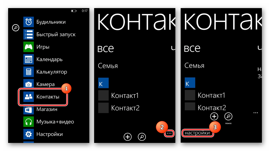 - Запускаем на телефоне приложение «Контакты» и переходим в «Настройки» нажав на изображение трех точек внизу экрана.