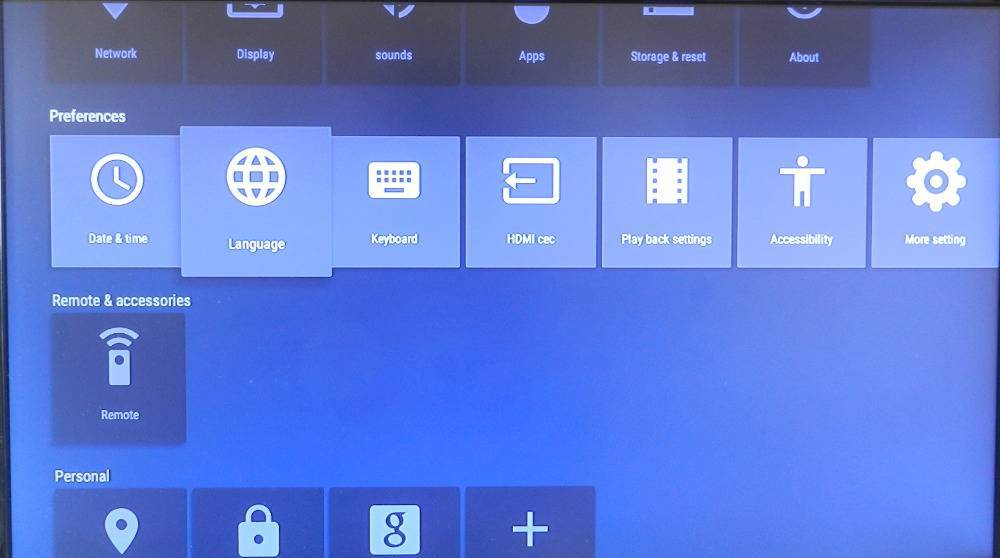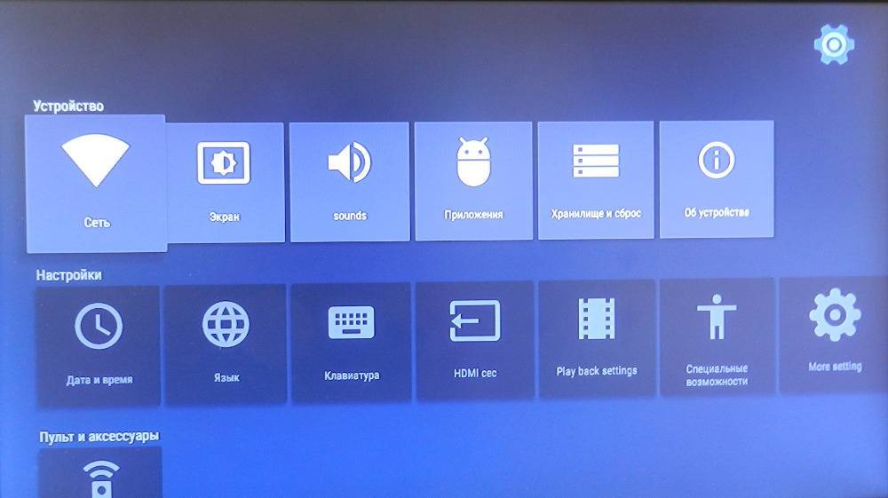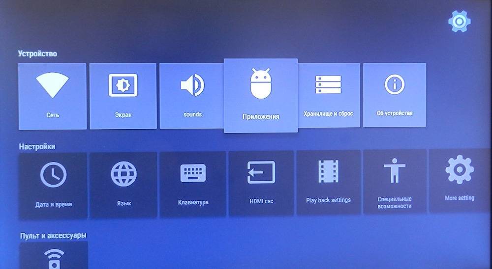 1) Локализация включает в себя установку языка устройства и временного пояса. Всё это делается через меню настроек. Найдите в меню андроид приставки пиктограмму «настройка» — шестерёнку и кликните на неё.