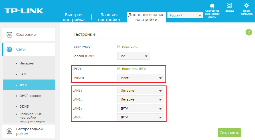 Если укажите обычный мост, появится ещё одна панель — на ней поставьте номер гнезда LAN (жёлтое), к которому будете подключать шнур от приставки TV. Кликните по «Сохранить». После этого подключите приставку к маршрутизатору и включите её. Подождите, пока произойдёт синхронизация, и на телевизоре появится картинка.