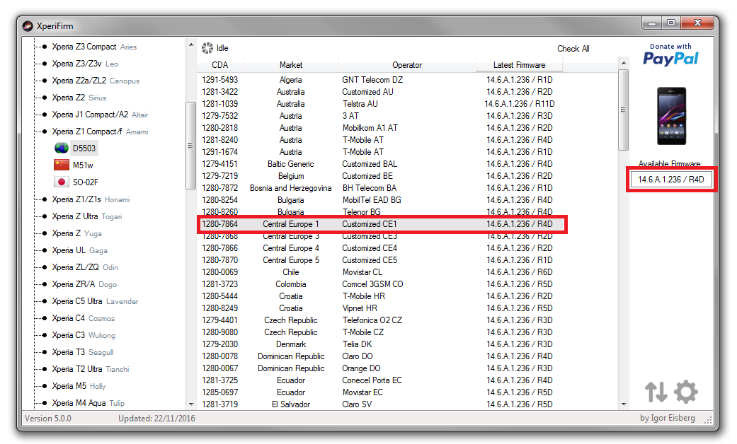 Нажмите кнопку «Проверить все» на верхней панели для проверки точной версии программного обеспечения, затем щелкните по столбцу «Последняя прошивка», для сортировки программного обеспечения один за другим. Выберите версию программного обеспечения 14.6.A.1.236 / R4D для региона Центральная Европа 1.