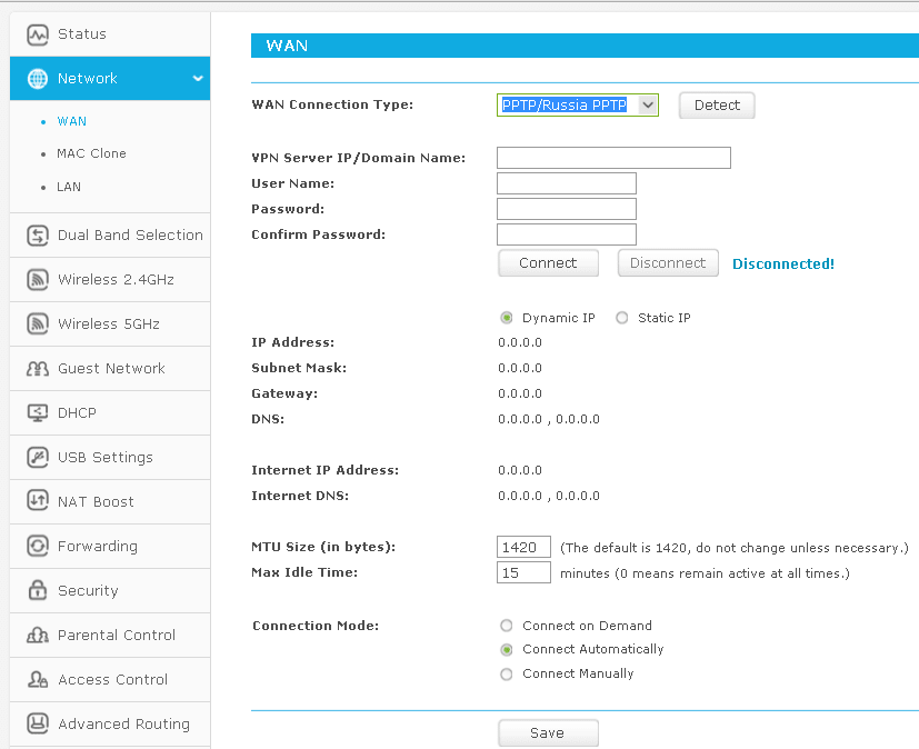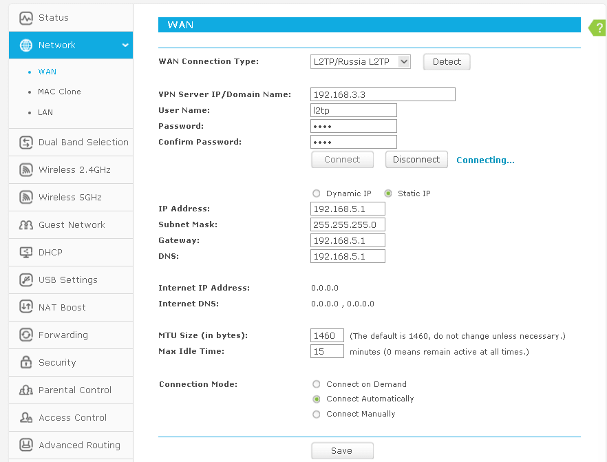 Первая строка «WAN Connection Type» — для создания и получения интернет-соединения в зависимости от предоставленного провайдером типа соединения выберите один из вариантов:
