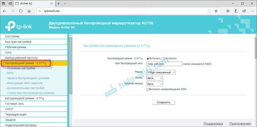Настройки Wi-Fi сети можно сменить в разделах “Беспроводной режим – 2.4 ГГц” и “Беспроводной режим – 5 ГГц” соответственно.