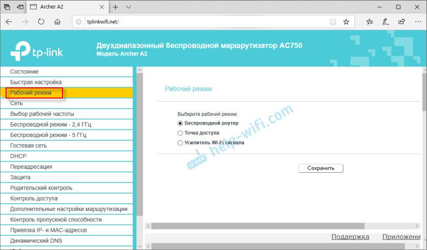 Сменить режим работы роутера (настроить его в качестве усилителя, или точки доступа) можно в разделе “Рабочий режим”.