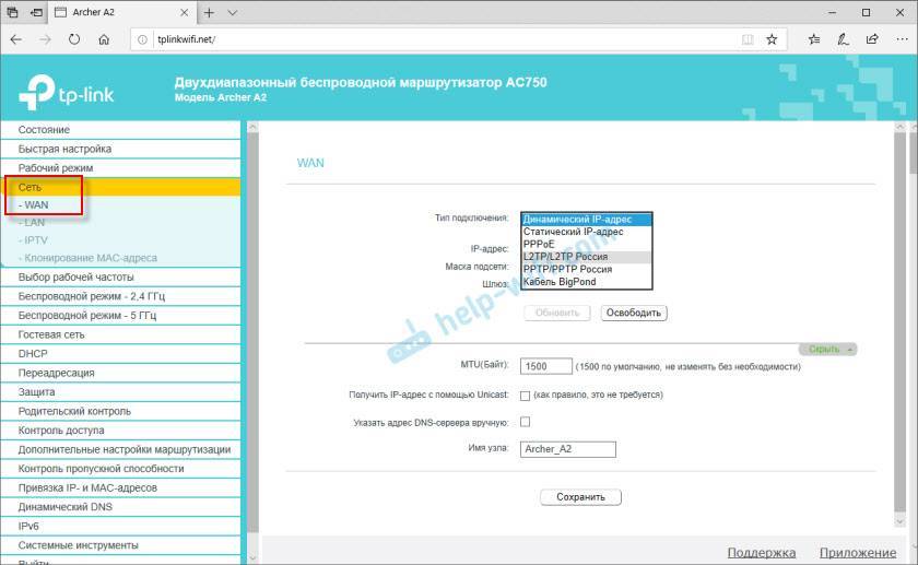 При необходимости вы всегда можете изменить разные настройки TP-Link Archer A2. Запускать для этого мастер быстрой настройки не обязательно. Параметры подключения к интернету, например, можно сменить в разделе “Сеть” – “WAN”.