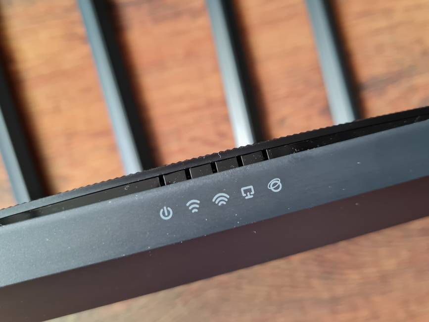 Сверху по центру — логотип производителя серебристого цвета, ниже под ним — полоска с индикаторами работы устройства. Отображается активность (питание) роутера, работы сетей 2,4 и 5 ГГц, подключение к LAN-портам и состояние сети.