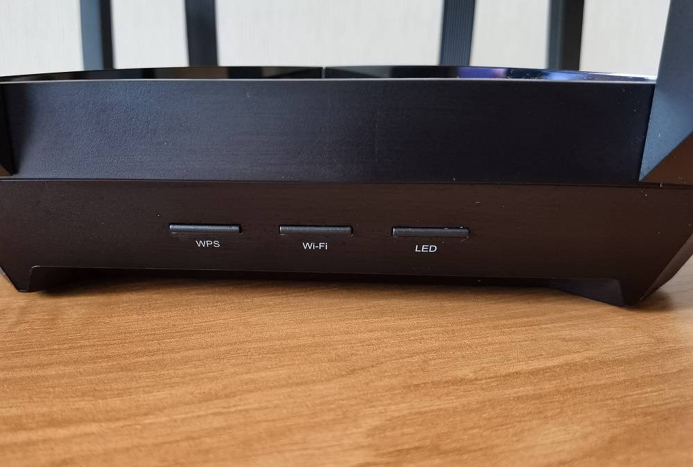 Перейдем к расположению важнейших элементов. Так, на передней стороне довольно привычно для меня после Archer C5400X, есть три кнопки: WPS, включение / выключение Wi-Fi и выключение подсветки логотипа (для использования нужно удерживать их около 2 секунд, что является защитой от случайного нажатия). Хотя кнопки здесь другой формы и не такие удобные, как на моем домашнем роутере.