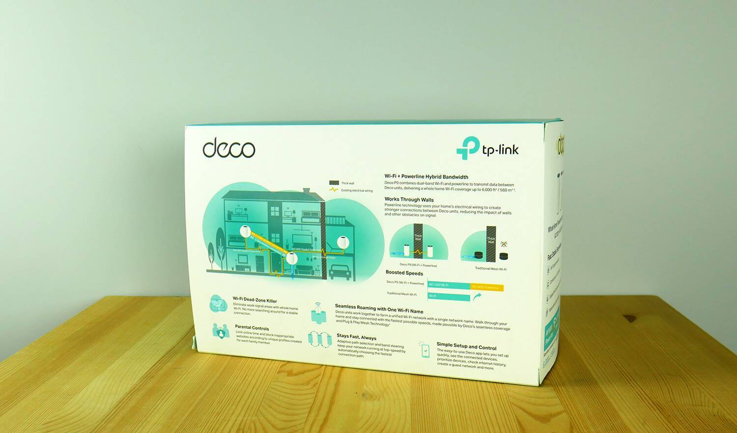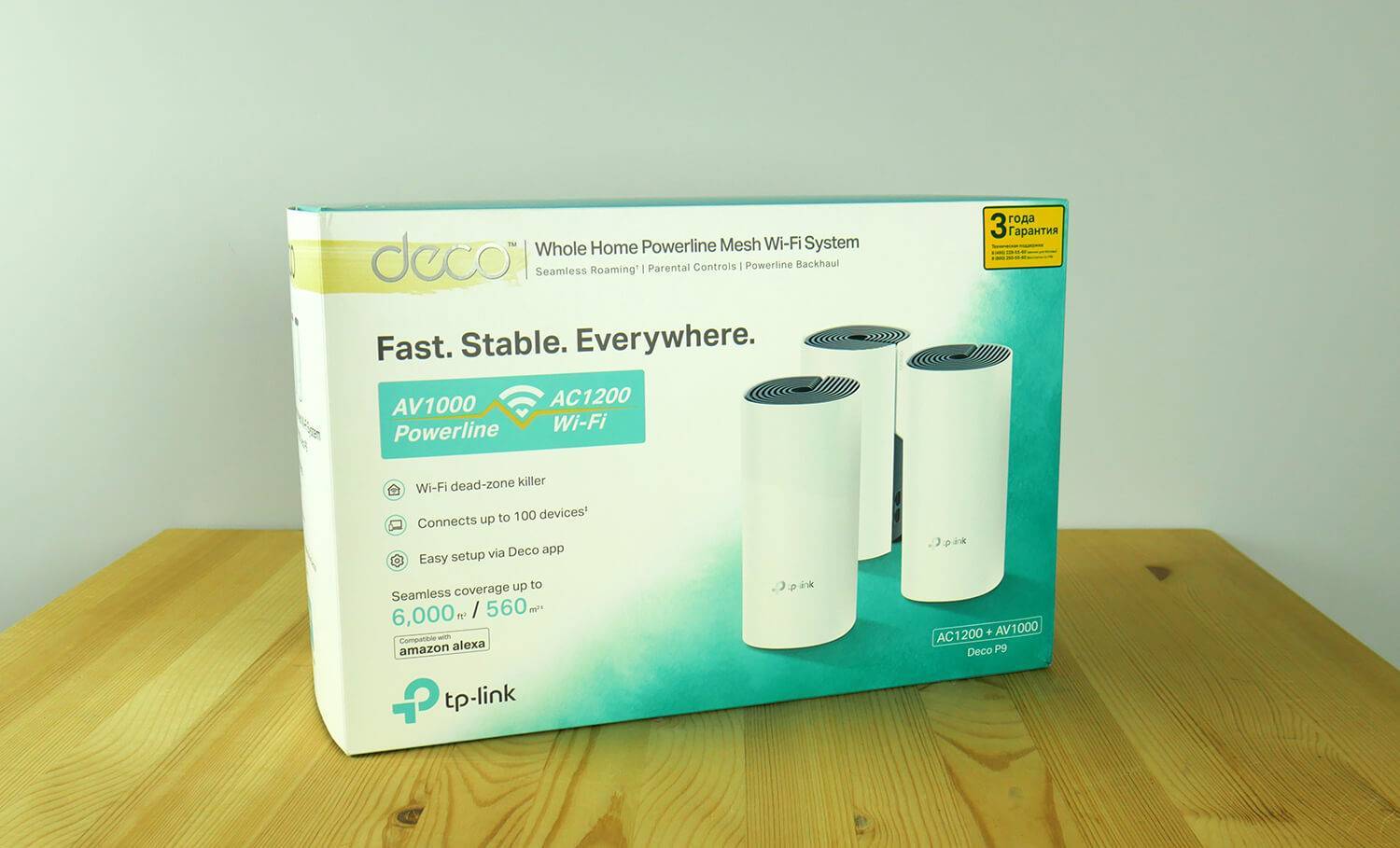 Tp-link Deco P9 упакован в прямоугольную бело-голубую коробку. На лицевой стороне изображены 3 модуля Deco P9 и приведены основные возможности, которые выделяет производитель: