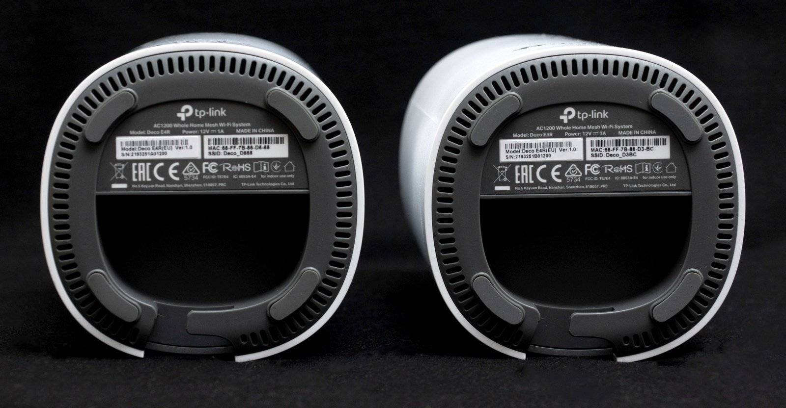 Устройства комплекта Deco E3 минималистичны. На обоих нет большого количества разнообразных разъемов на все случаи жизни. Начнем с роутера Deco E4R (дизайн которого уже встречался у других моделей этой линейки). Он сделан в форме небольшой (190,5×90,7×90,7 мм) белой башни. Сверху у него есть тиснение в форме буквы «Р», внутри которого расположен логотип TP-Link. Он же является индикатором состояния устройства. Спереди есть еще один логотип (простой, без подсветки), а сзади небольшой вырез с парой Ethernet-портов. Снизу есть четыре прорезиненные ножки для устойчивости, вентиляционные прорези, кнопка Reset и порт питания.