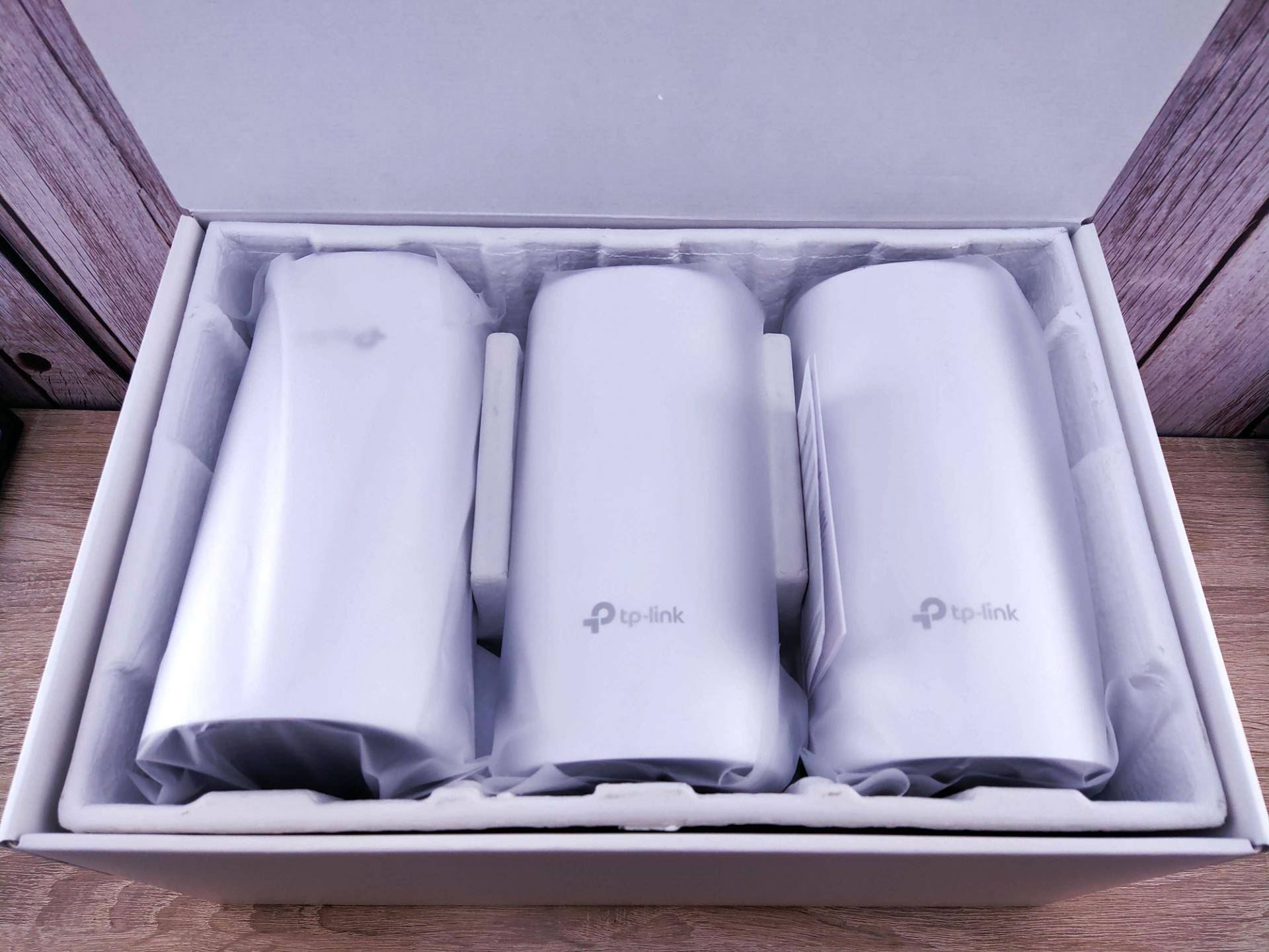 В коробке — три одинаковых устройства-модуля цилиндрической формы. Цвет: белый. К каждому — адаптер питания. Станут узлами домашней беспроводной сети.