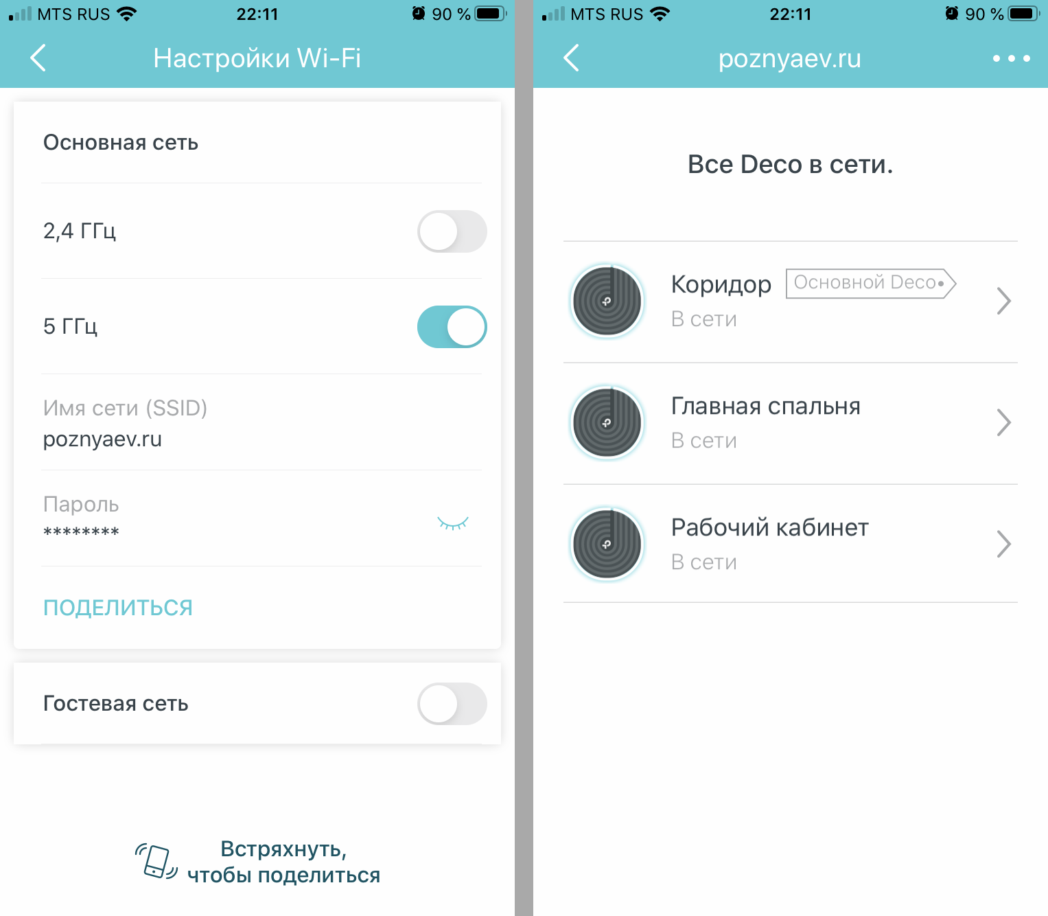Настройки Wi-Fi: можно включить или отключить диапазон сети, посмотреть пароль, поделиться им для подключения, создать гостевую сеть.