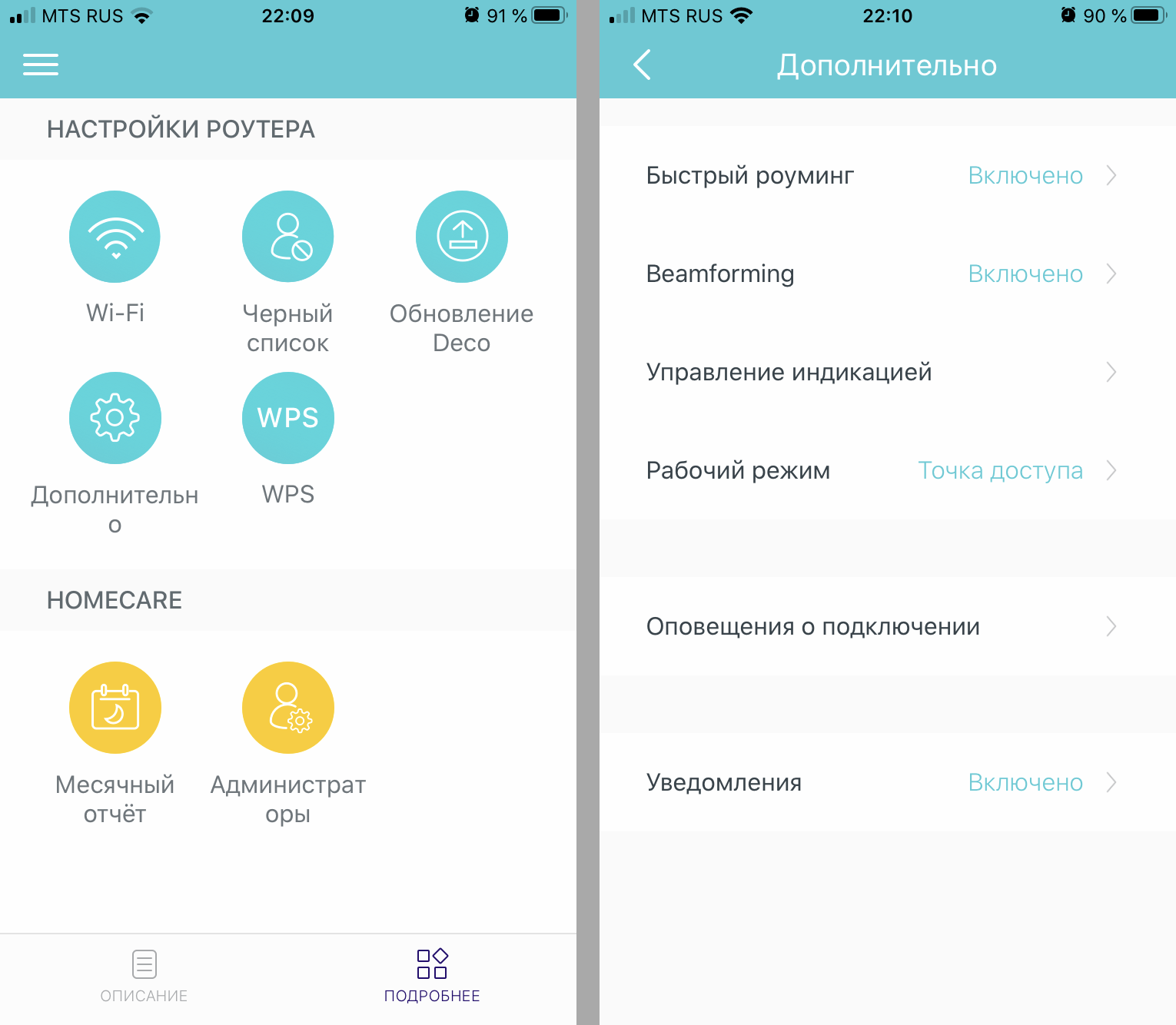 Рабочий режим переключается между двух вариантов: роутер и точка доступа. В первом случае Deco подключается к сети напрямую. Во втором – через роутер, расширяя уже существующую сеть. В этом режиме не поддерживаются функции NAT, QoS и родительский контроль.