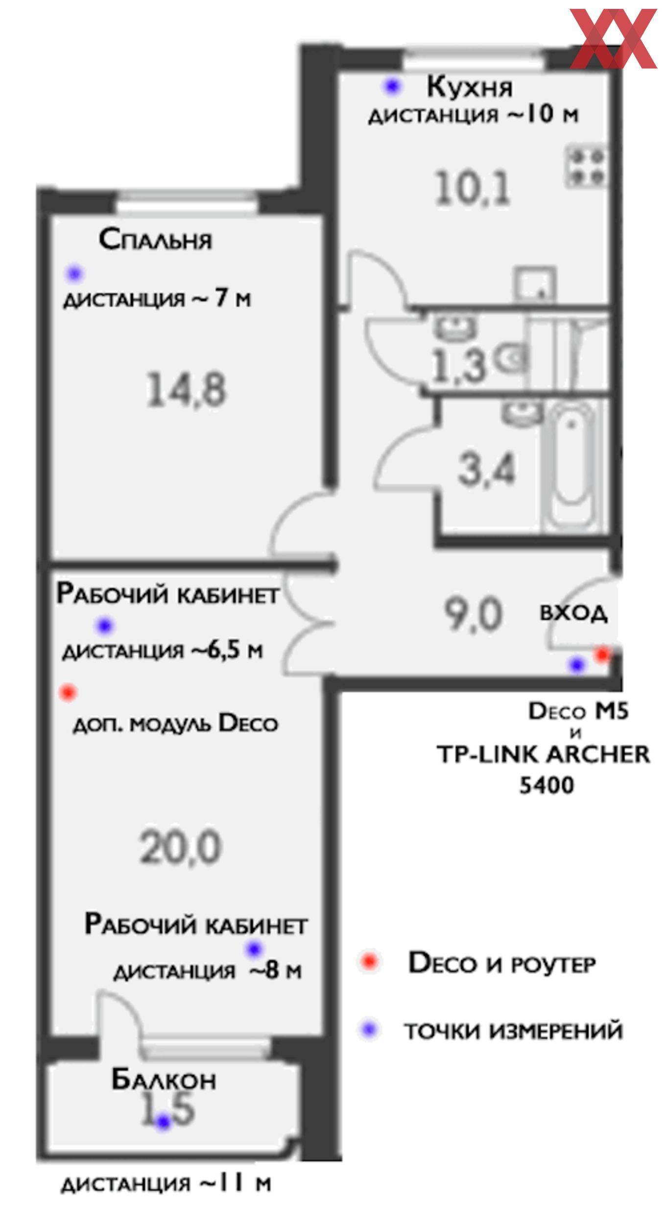 Ниже представлен план помещения, где указаны точки измерений и устройства TP-Link. Напомним, что TP-Link Archer 5400 используется в режиме проводного роутера (Wi-Fi функции отключены), основная точка DECO в режиме AP подключена к нему посредством Ethernet. Измерения производятся на Macbook 12 c Mac OS X Mojave.