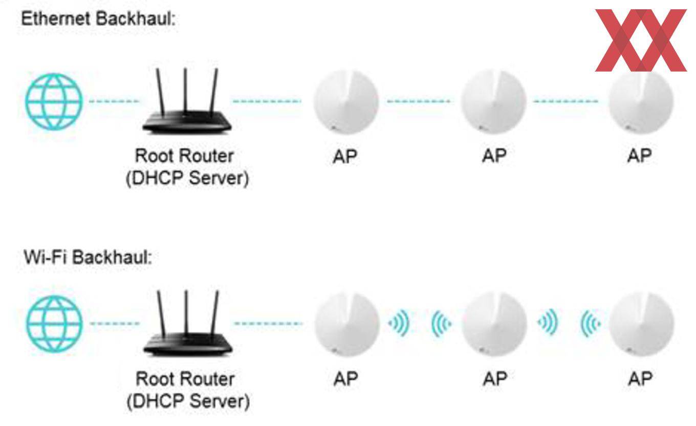 Выручила технология магистрали Ethernet Backhaul. Суть понятна и так, но на этой иллюстрации с сайта производителя всё совсем уж наглядно. Информация между модулями Deco M5 передается не по сети WLAN, а кабелем Ethernet.