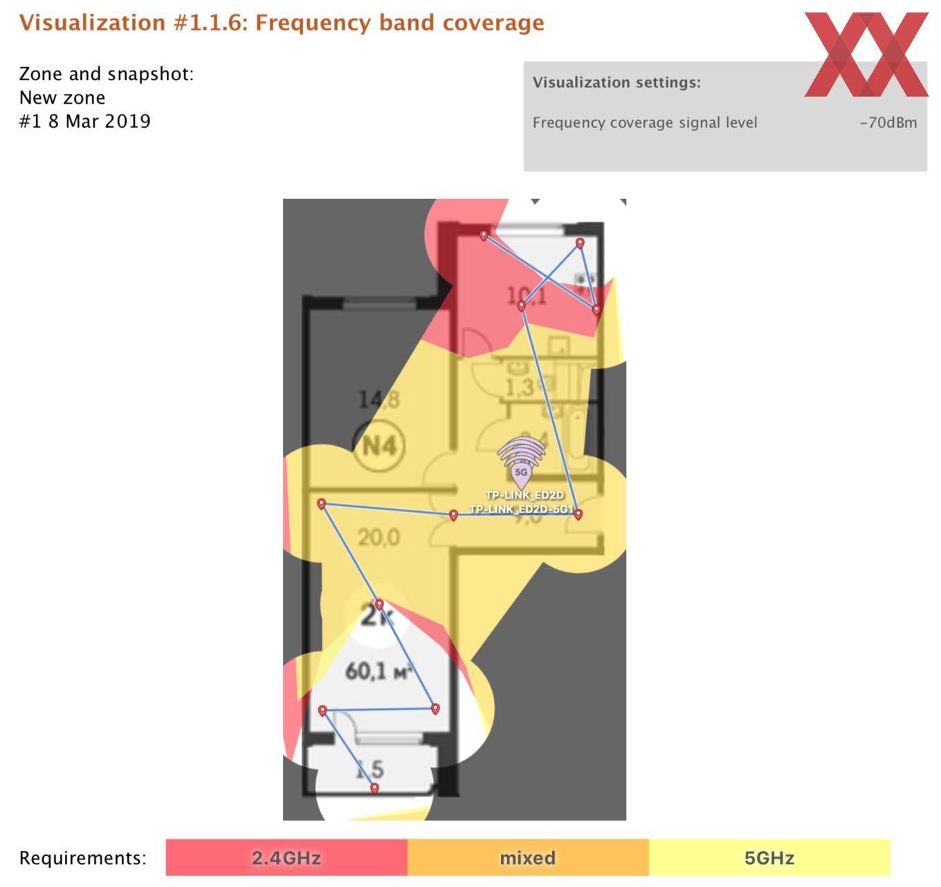 Перед установкой и тестированием Deco M5 был составлен отчёт о состоянии «радиоэфира» с помощью утилиты NetSpot. Ниже представлен план квартиры с обозначенными точками измерений. Если не вдаваться в подробности, то картина получилась неутешительная: