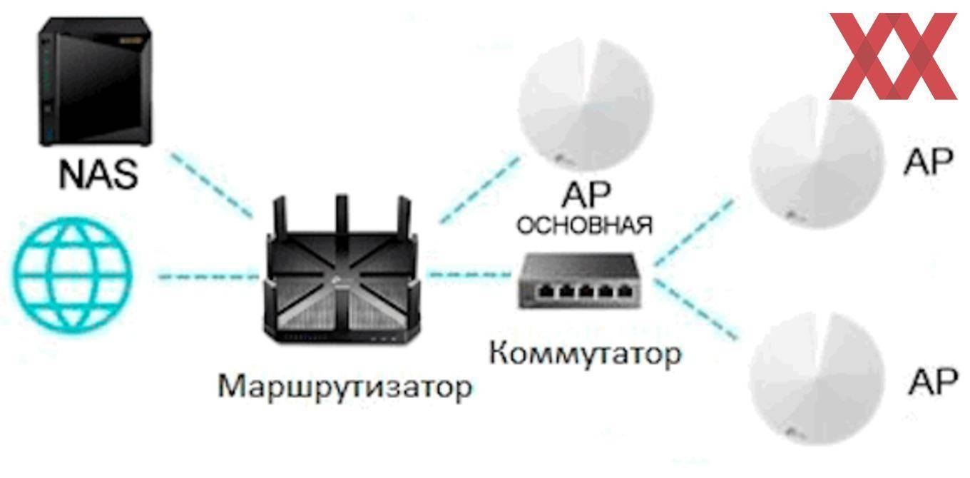 Основная AP проводом подключена к роутеру, дополнительные связаны с ней по WLAN.