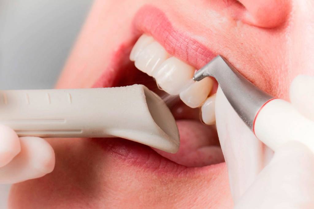 - При сильных отложениях – так называемых зубных бляшках, которые глубоко проникли в эмаль через поры, дополнительно используют пескоструйный прибор Air-Flow. Зубные бляшки в этом случае удаляются за счет мелкодисперсной смеси, состоящей из воды, соды и воздуха, подаваемой под давлением на поверхность зубов. При этом зубы дополнительно полируются, в результате чего к ним возвращаются идеальная гладкость и природный блеск.