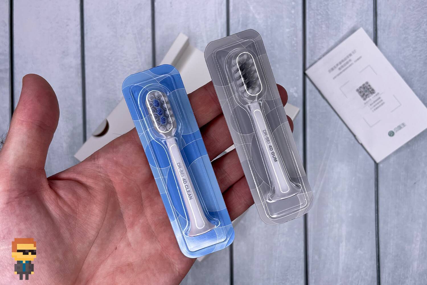 Первая — «4D CLEAN» с синей щетиной предназначена для тщательной очистки зубов. Удаляет также налет от табака. При изготовлении данной насадки мягкие щетинки от японской компании TORAY комбинированы со сверхтонкими и пластичными от немецкой компании Pedex.