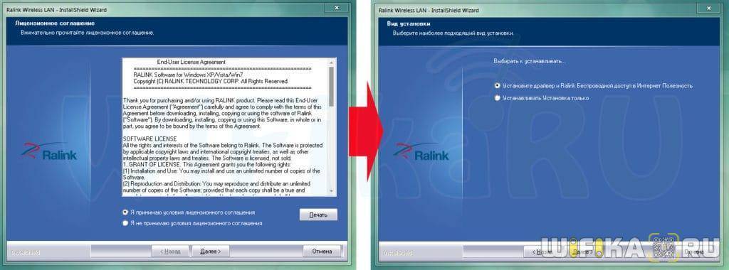 Нам нужно запустить файл 3070setup.exe. Сначала соглашаемся с лицензионным соглашением, после чего выбираем тип установки — только драйвера Comfast или вместе с фирменным приложением — перевод китайцев немного хромает, но суть содержимого понятна.
