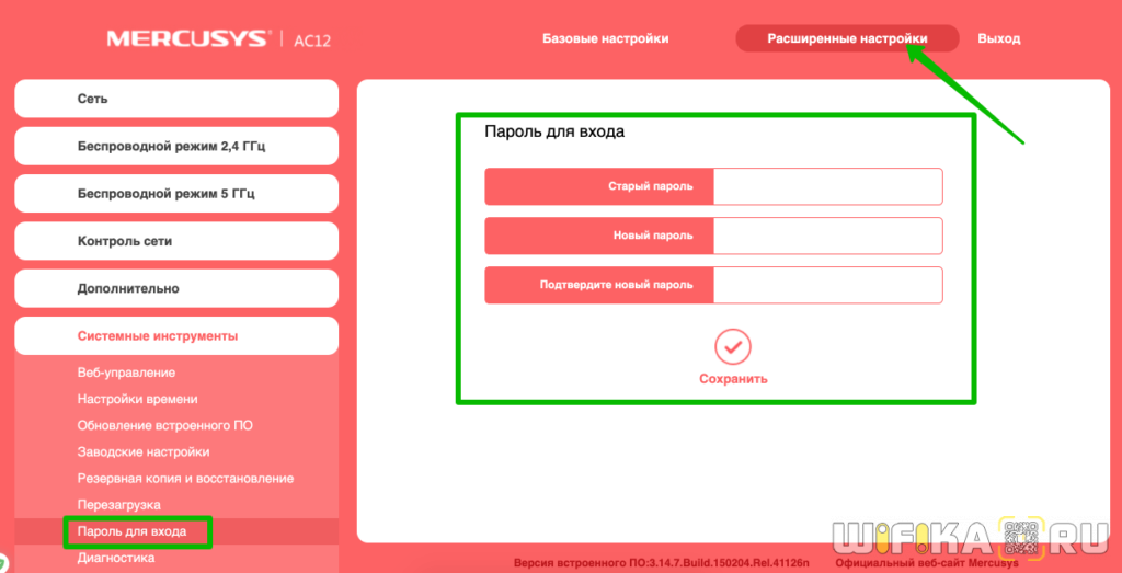 Впоследствии поменять пароль для авторизации в админке Mercusys можно будет в панели управления в разделе «Расширенные настройки — Системные инструменты — Пароль для входа». В случае его утери помогает только сброс к заводским настройкам кнопкой «Reset» на корпусе.