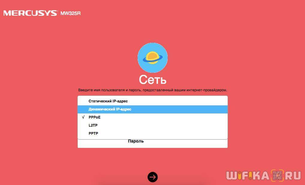 . Нужно выбрать тип подключения, и если необходимо, то указать параметры, которые выдает провайдер (имя пользователя, пароль)