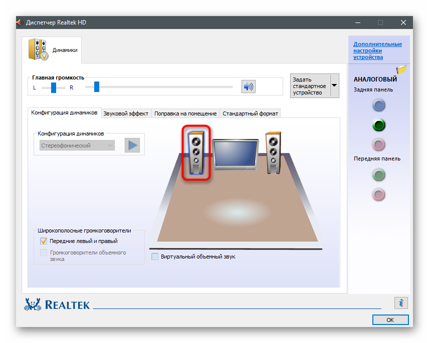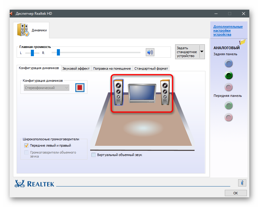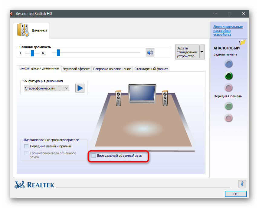 Сейчас практически все драйверы для звуковых карт поддерживают виртуальный объемный звук, который особенно полезен при игре в шутеры, где важную роль играет позиционирование врага. Однако эта функция используется и при воспроизведении фильмов или музыки, привнося новые нотки в звучание. Не все наушники корректно справляются с этой функцией, поэтому и возникает ощущение того, что одно «ухо» играет тише другого. В Диспетчере управления звуком эта возможность отключается в один клик на главной вкладке и называется «Виртуальный объемный звук».