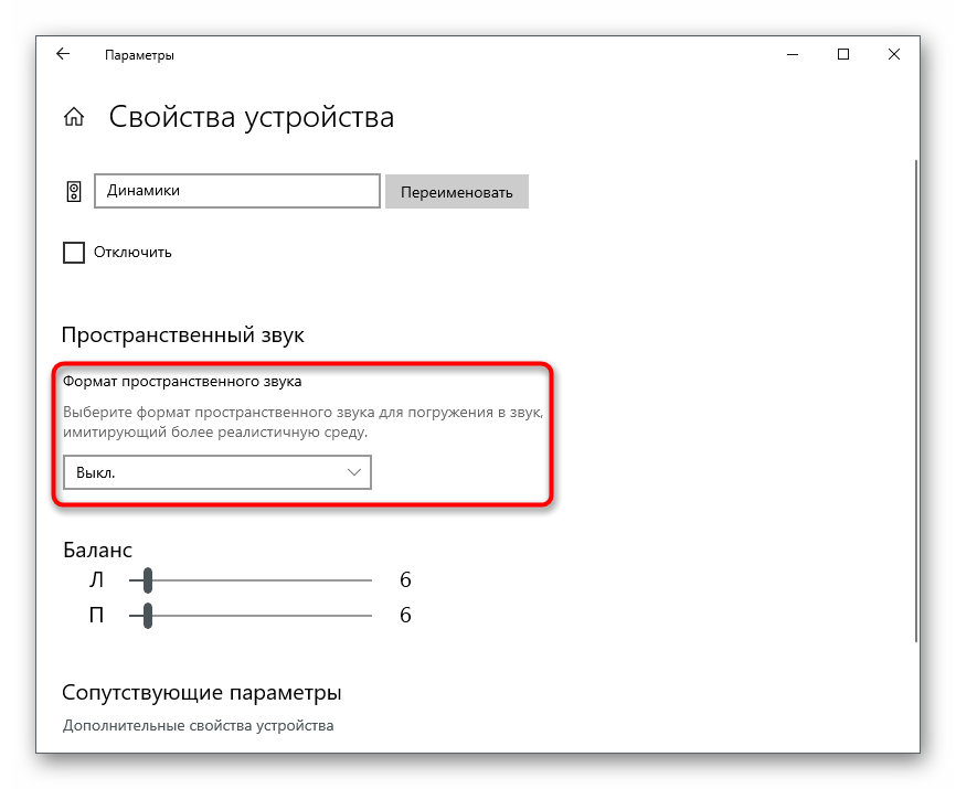 Если речь идет о встроенной в операционную систему функции, придется выполнить описанные ранее действия, чтобы открыть меню «Свойства устройства». Там вы найдете параметр «Формат пространственного звука» и из выпадающего списка сможете выбрать вариант отключения.